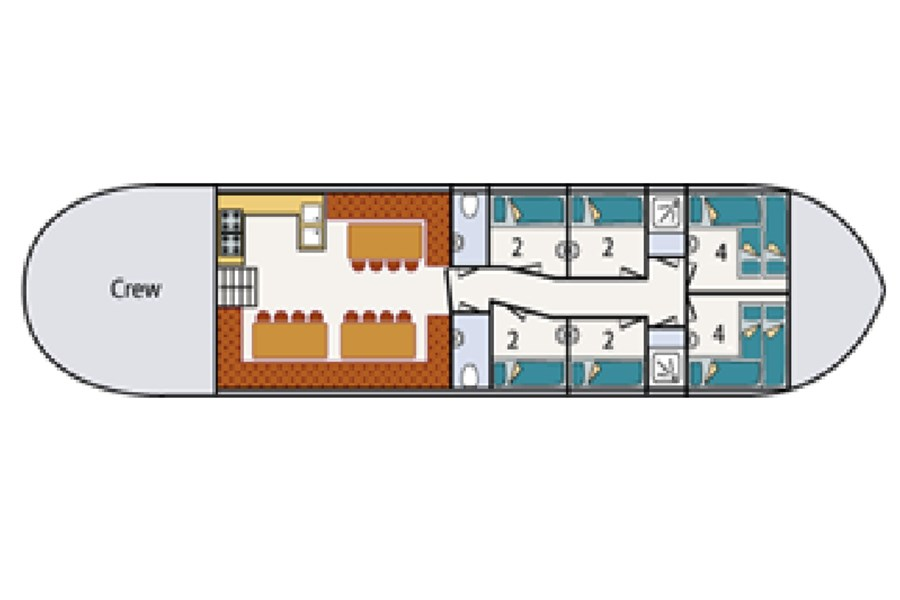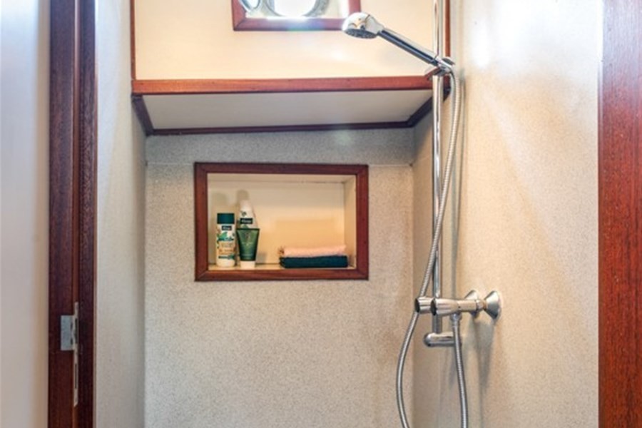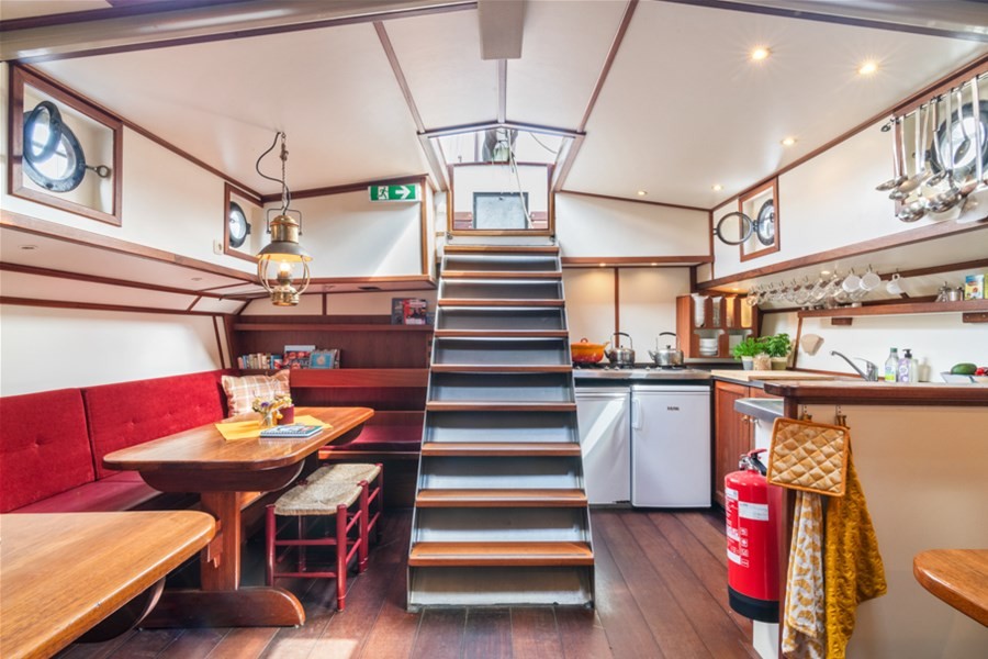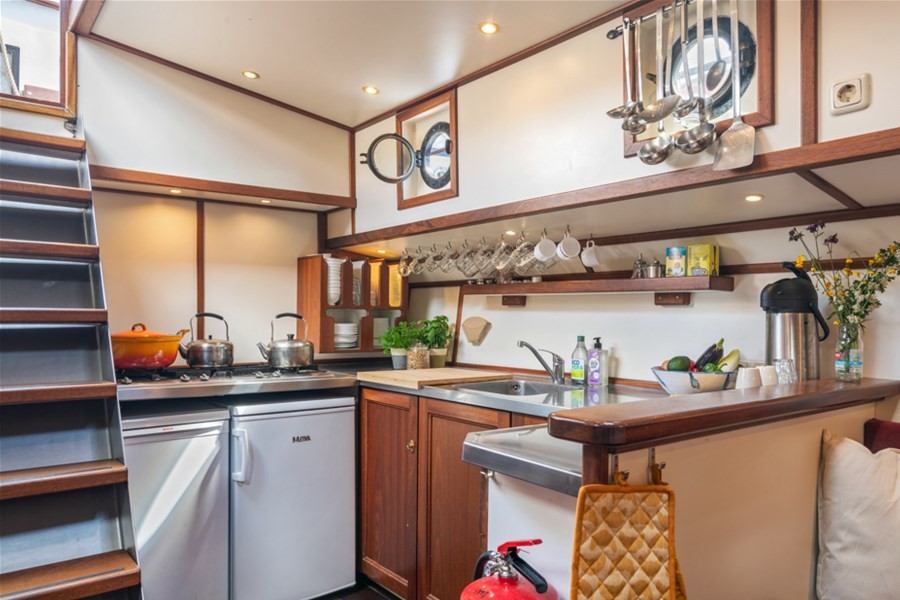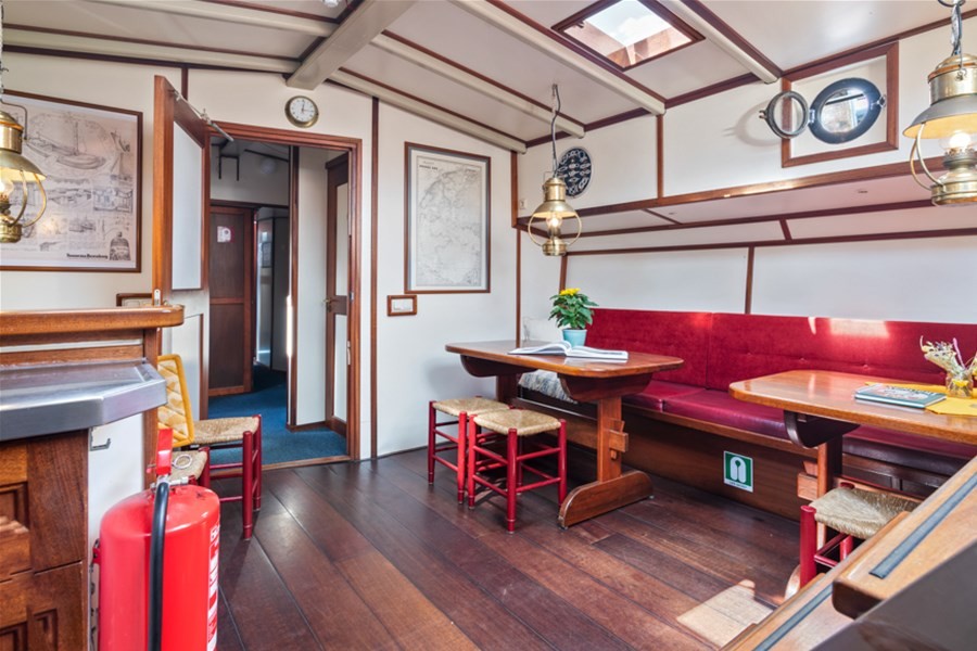 Onder dek bevindt zich een ruime salon waar de hele groep samen kan komen. De warme inrichting en de praktische opzet zorgen voor een ontspannen sfeer tijdens het verblijf aan boord. Hier kunt u gezamenlijk eten, een spel spelen of de dag afsluiten na een actieve zeildag. De kombuis is compleet ingericht met alles wat nodig is om voor grotere groepen te koken. Hierdoor is de Middelsee zeer geschikt voor zowel dagtochten als meerdaagse zeilreizen.