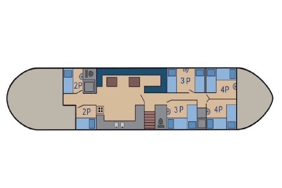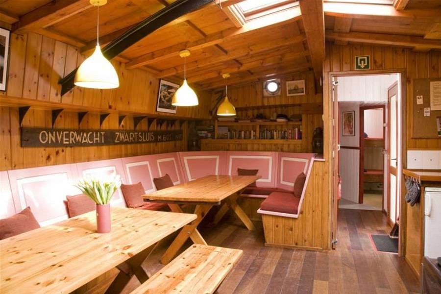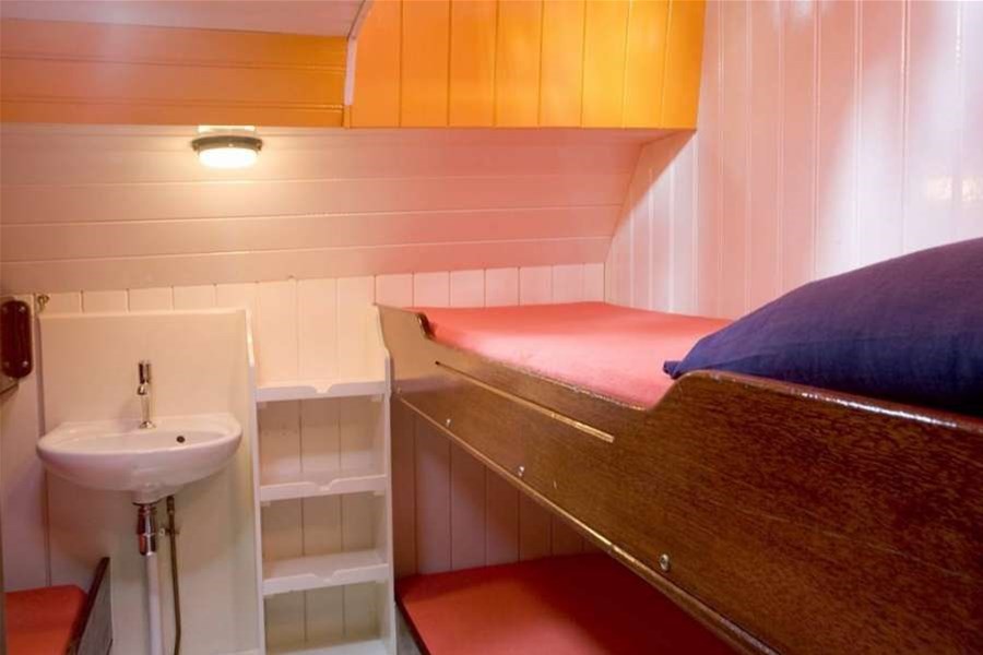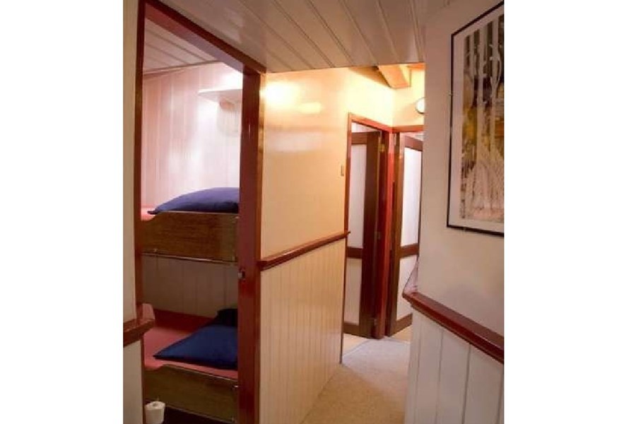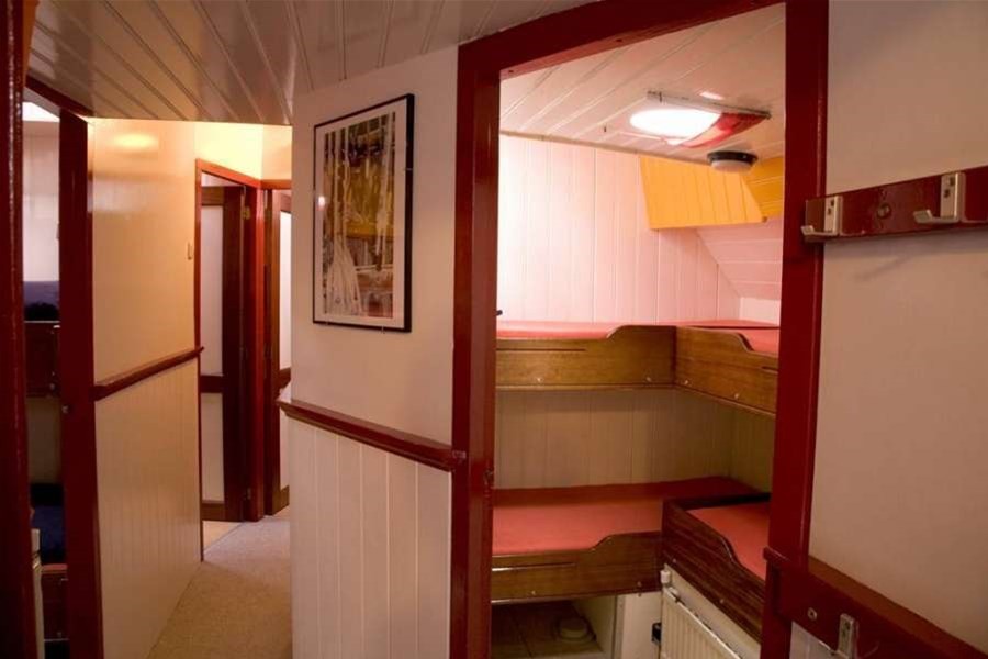 Onder dek bevindt zich een lichte en overzichtelijke salon met voldoende zitplaatsen voor de hele groep. Hier is ruimte om samen te eten, spelletjes te doen of de dag rustig af te sluiten. De warme houten afwerking zorgt voor een huiselijke sfeer. De kombuis is praktisch ingericht met een gasfornuis, oven, koelkast en koffiezetapparaat. Hierdoor kunt u eenvoudig maaltijden bereiden voor de hele groep.Comfortabel overnachten aan boord