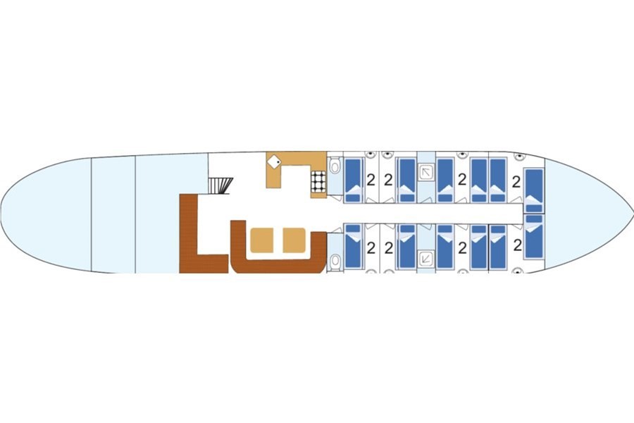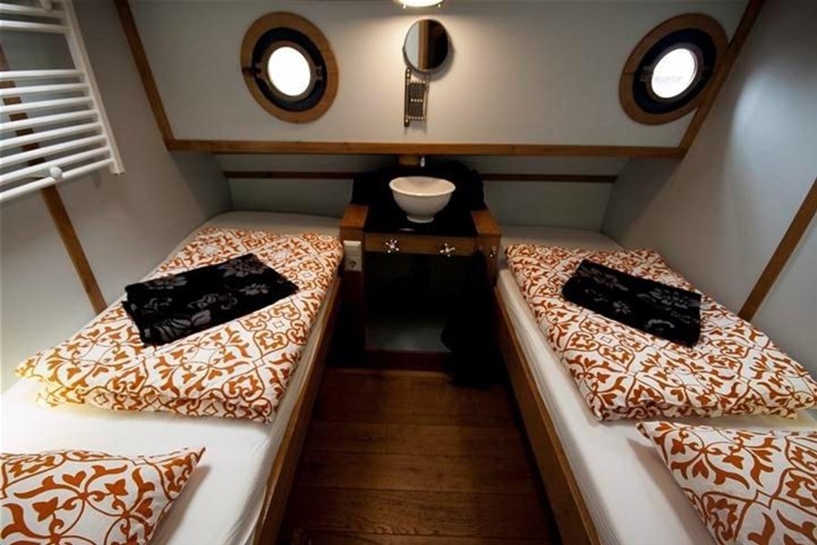 In totaal zijn er acht tweepersoons hutten aan boord, alle voorzien van stevige matrassen, een wastafel met warm en koud water, een radiator, patrijspoort en dekraam. Bijzonder en zijn de vier hutten zonder stapelbed. Op de gang bevindt zich het sanitair: twee toiletten en twee ruime douches.