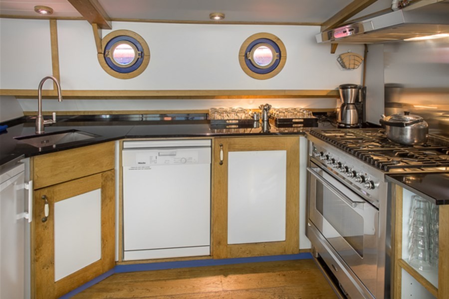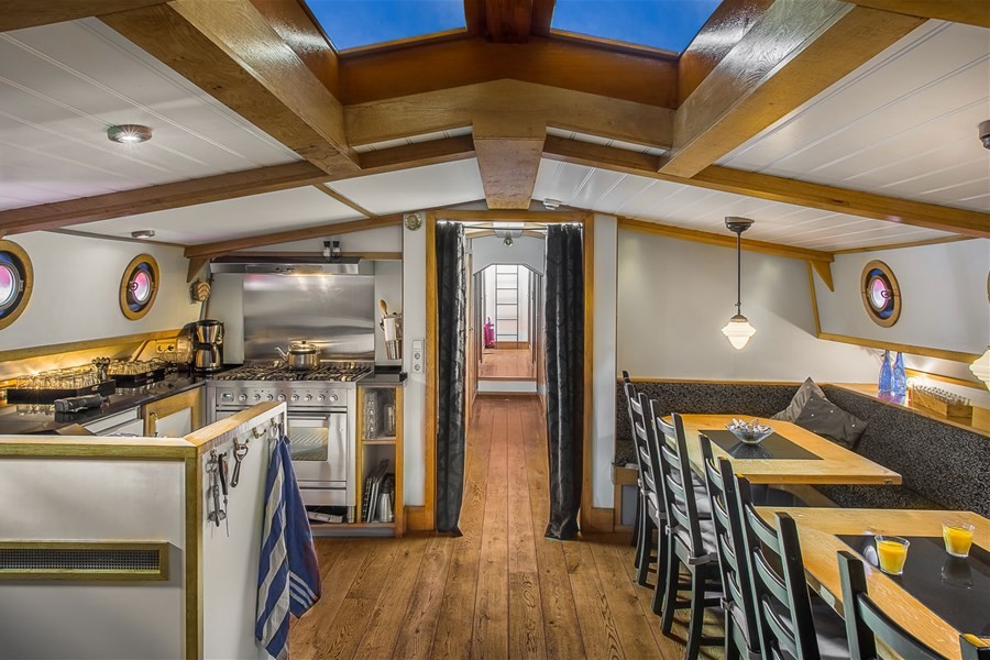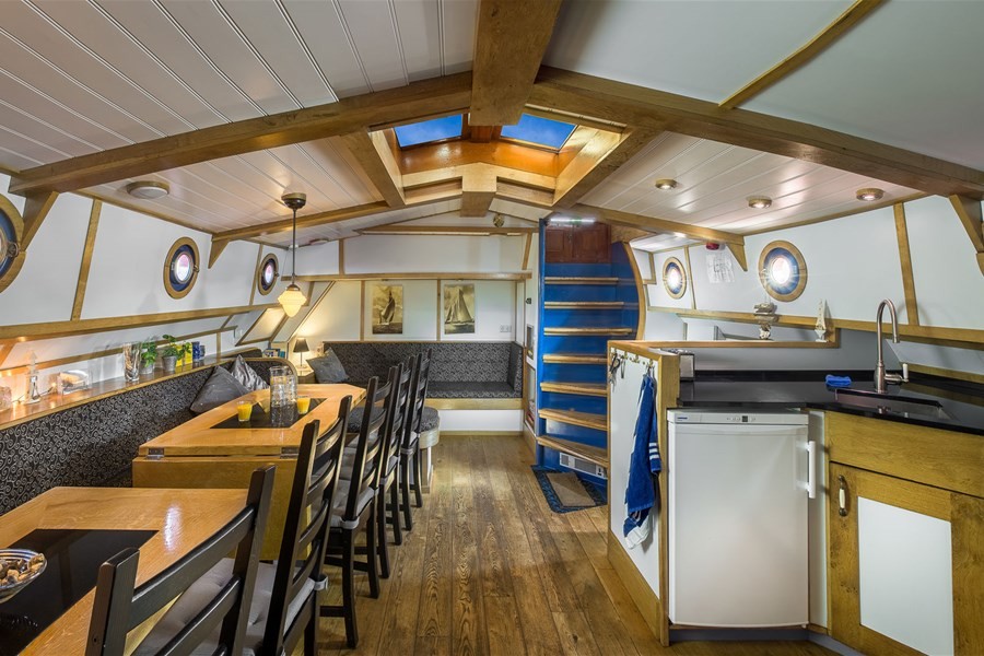Vanuit de ruime kuip leidt een ronde trap naar het lichte, sfeervolle verblijf. Hier vindt u een gezellige grote tafel, lekkere loungebank en volop mogelijkheden voor vermaak: een (marmeren) schaakspel, Kolonisten van Catan, speelkaarten, poker en Backgammon. In de scheepsbibliotheek bevinden zich veel nautische boeken en tijdschriften. De ruime keuken is van alle gemakken voorzien: een groot granieten aanrecht voor veel werkruimte, een zespits Boretti gasfornuis met oven en afzuigkap, twee koelkasten en een vaatwasser.